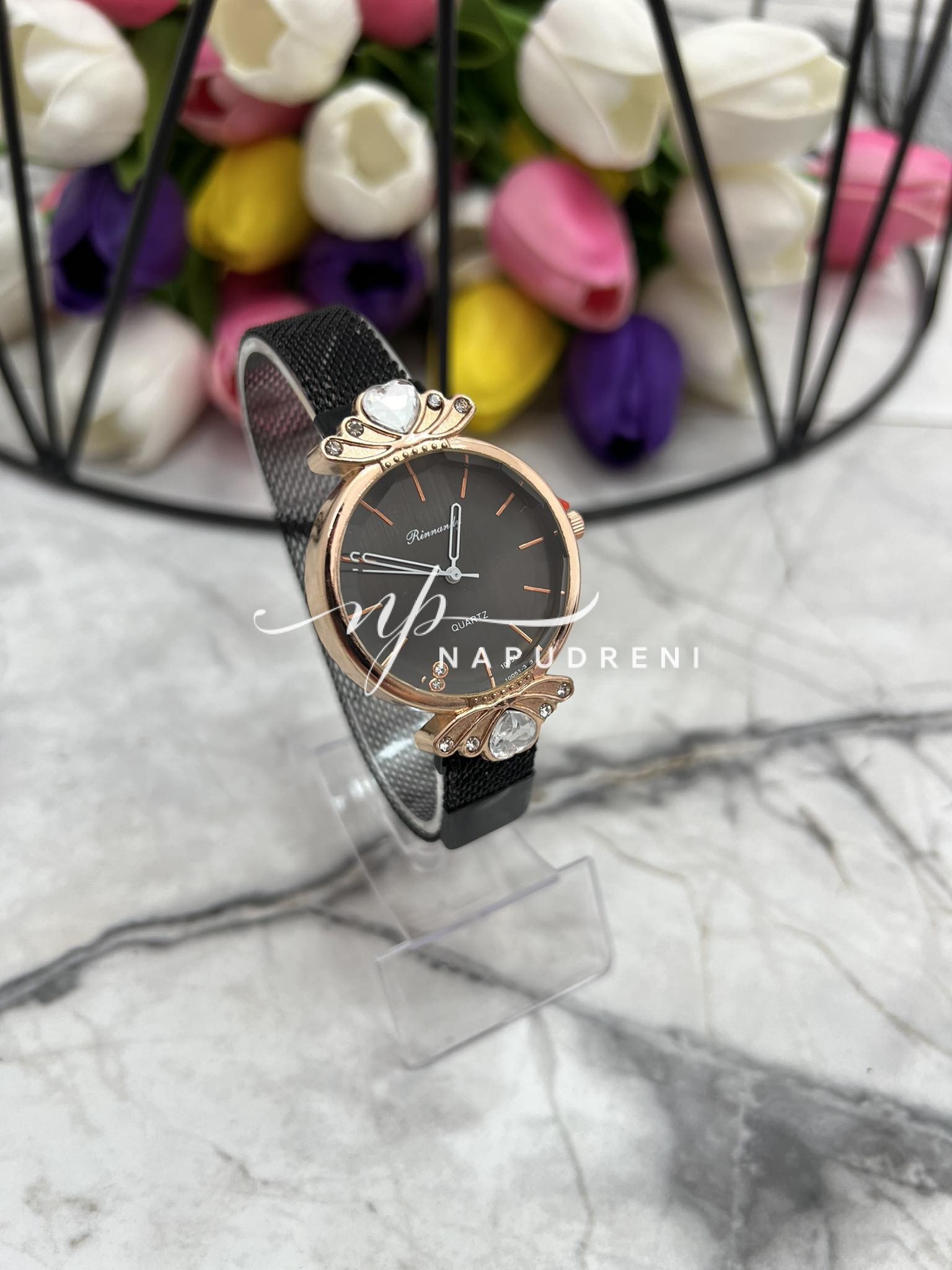 Дамски часовник с камъче сърце в черен цвят – код 7406