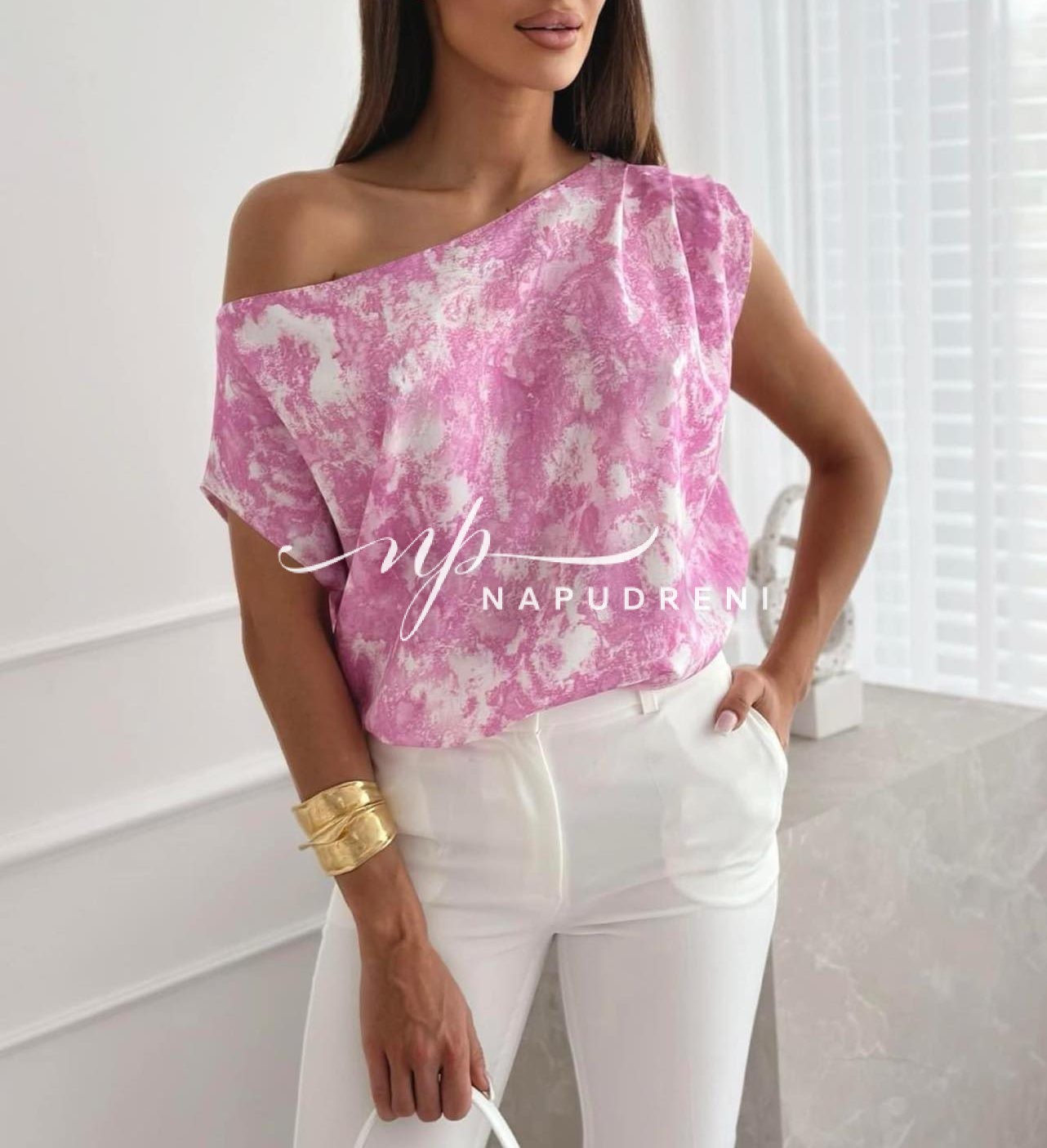 Блузата е с паднало рамо.