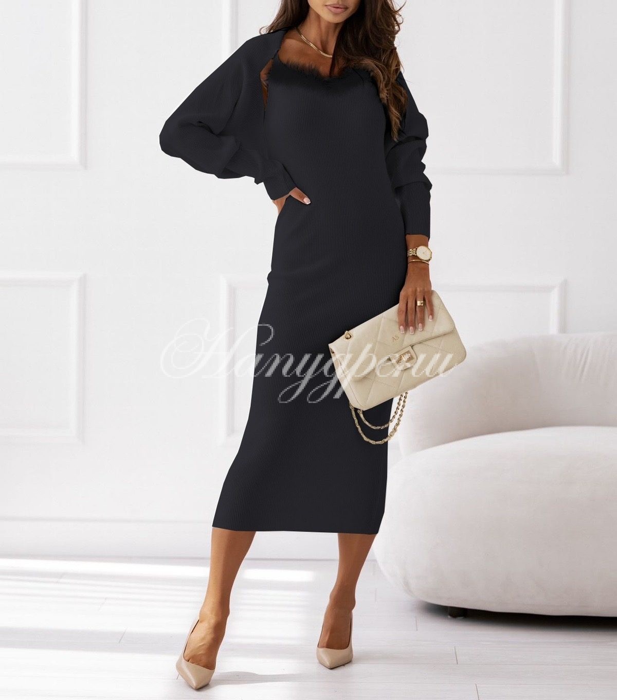 Моделът се състои от две части – къса жилетка и рокля по тялото с дължина над глезена.