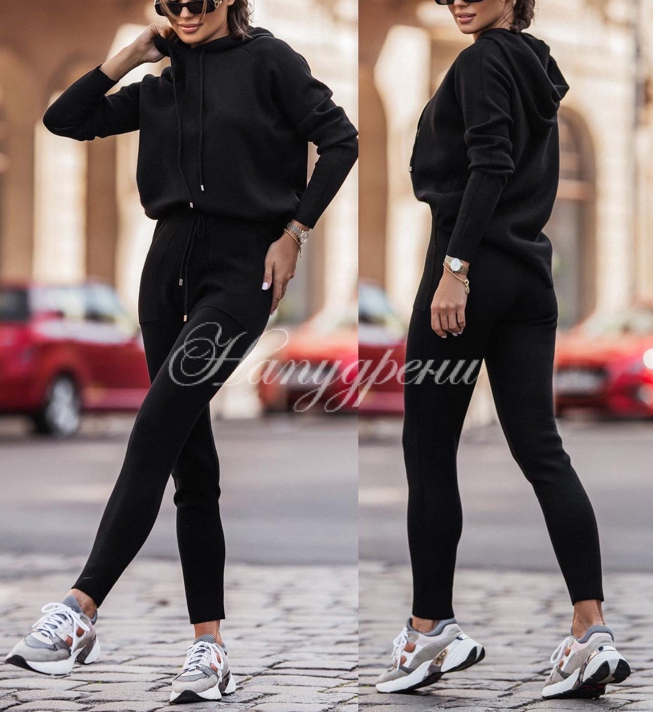 Спортен сет от две части с качулка и връзки в черен цвят – код 6083