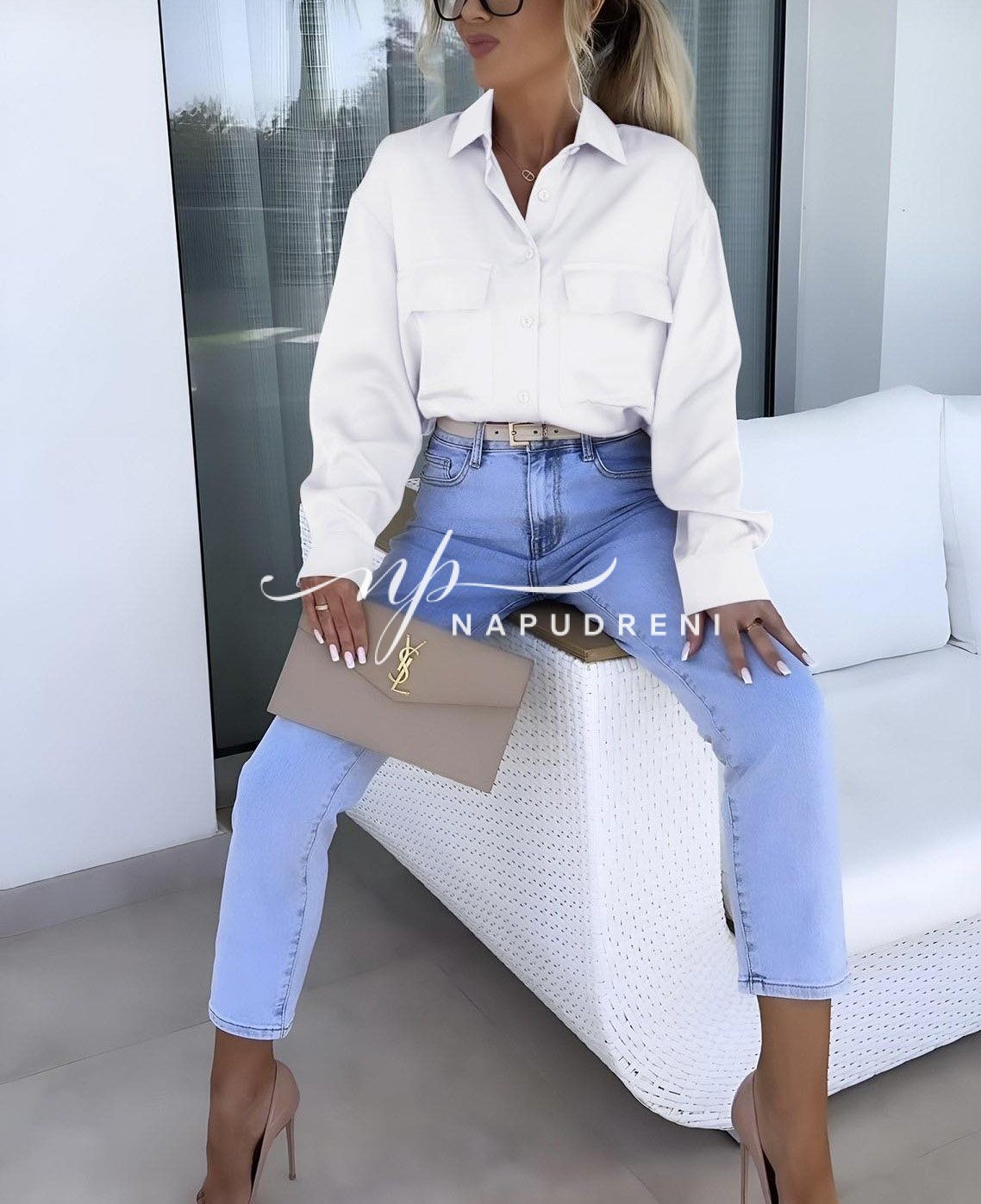 Дамска сатенена риза в бял цвят – код 6804