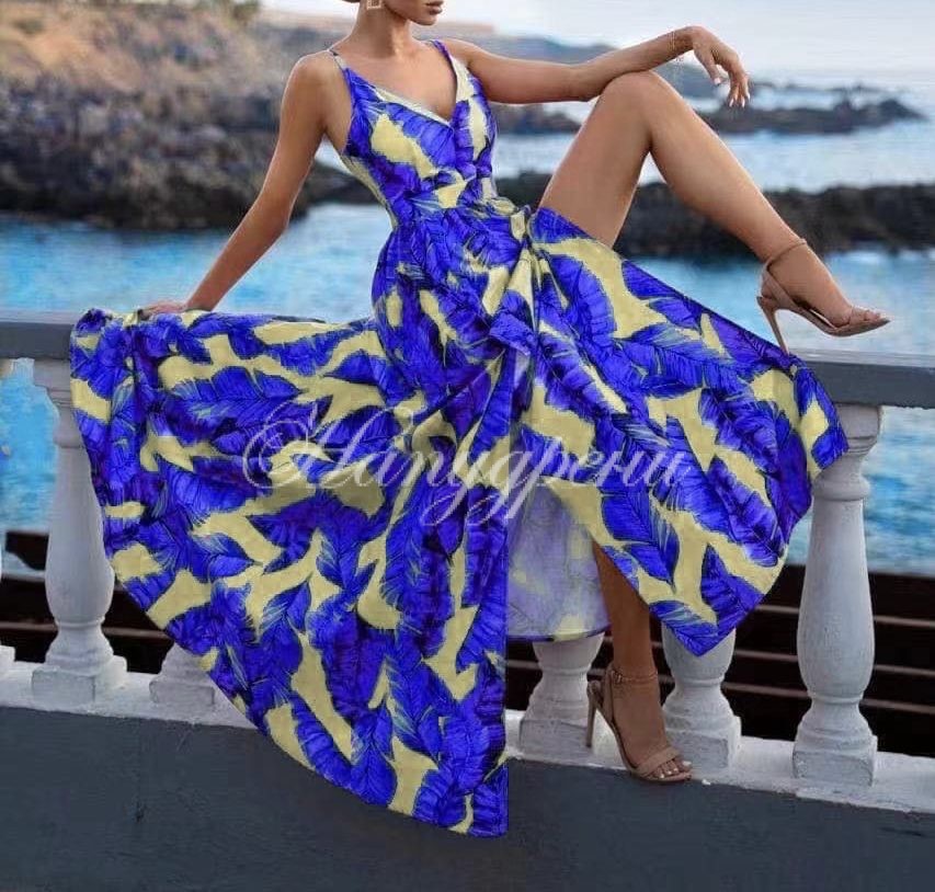 Елегантна дълга рокля “Siren” в жълто-син цвят – код 5596