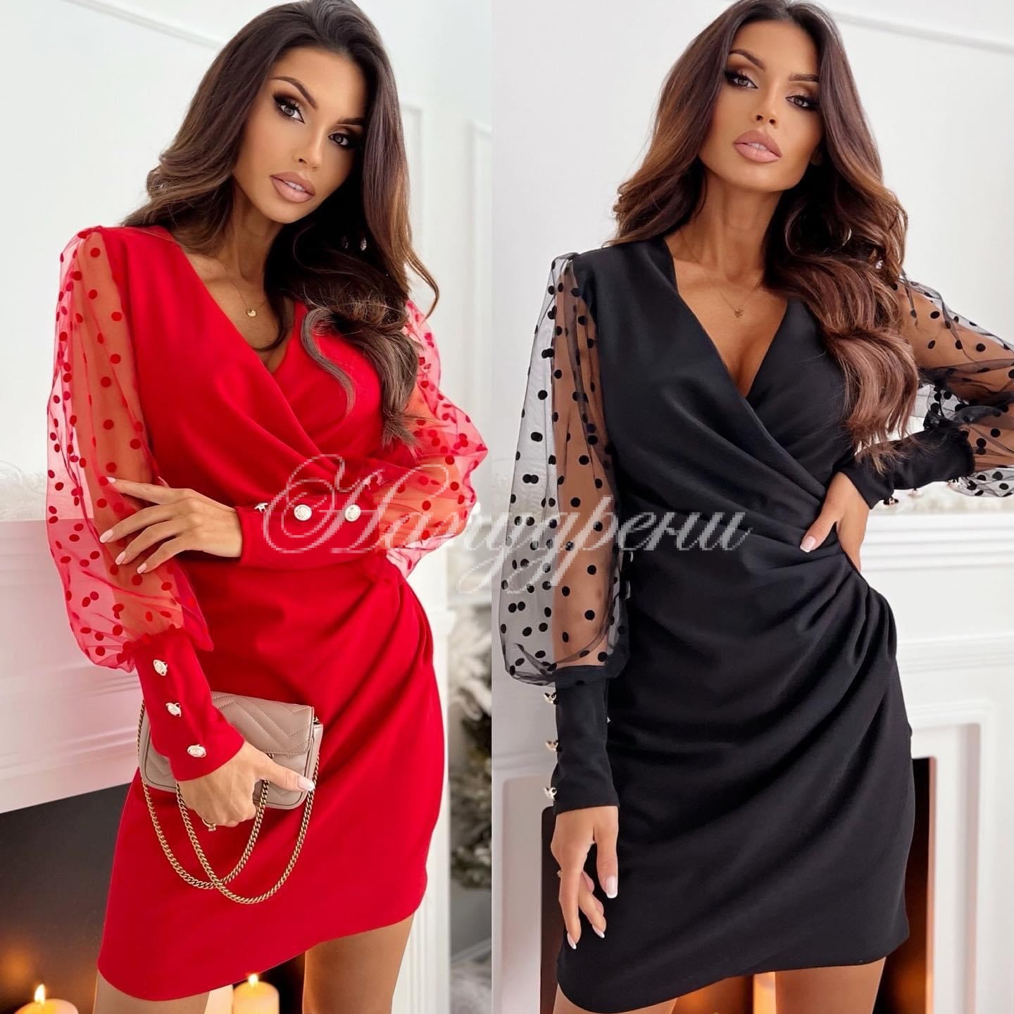Елегантна рокля с мрежести ръкави в червен цвят – код 6402