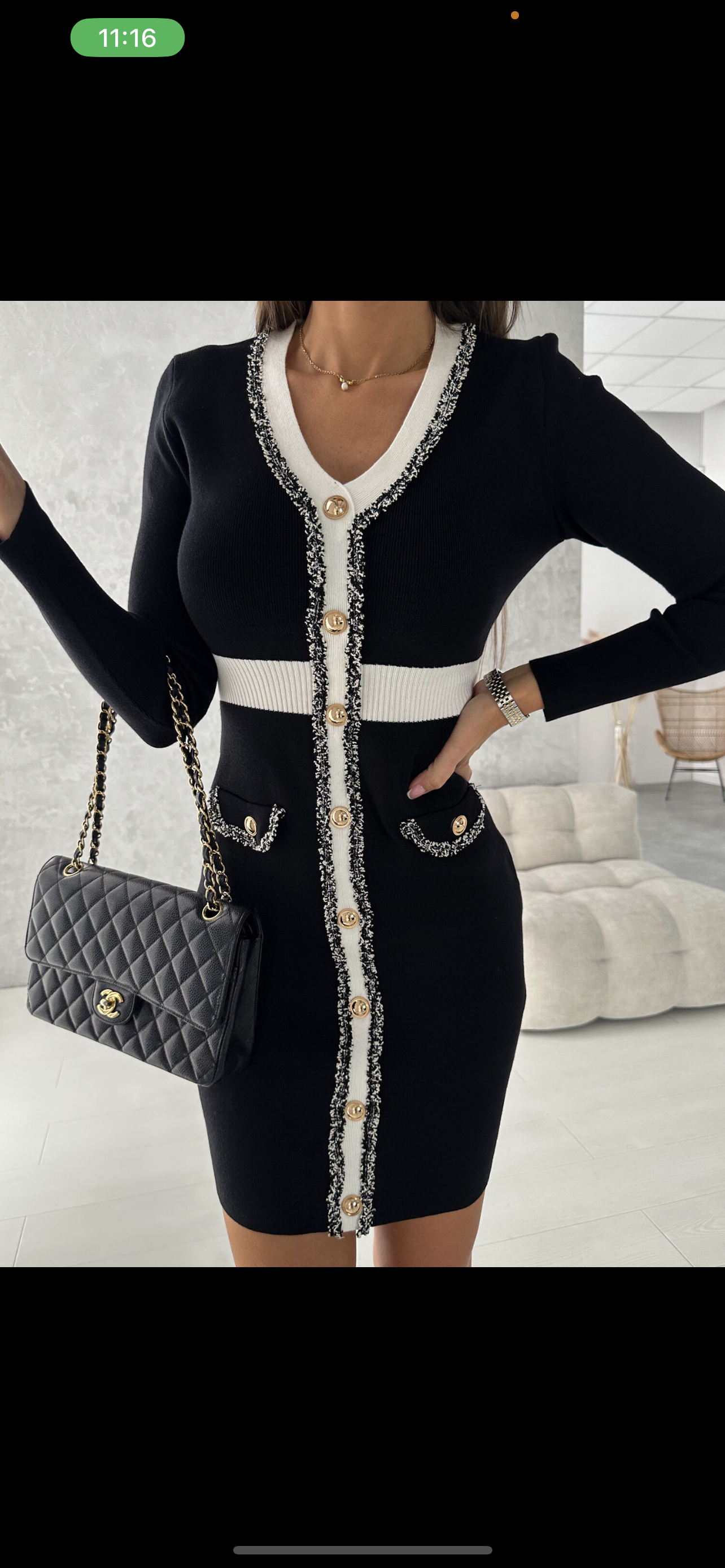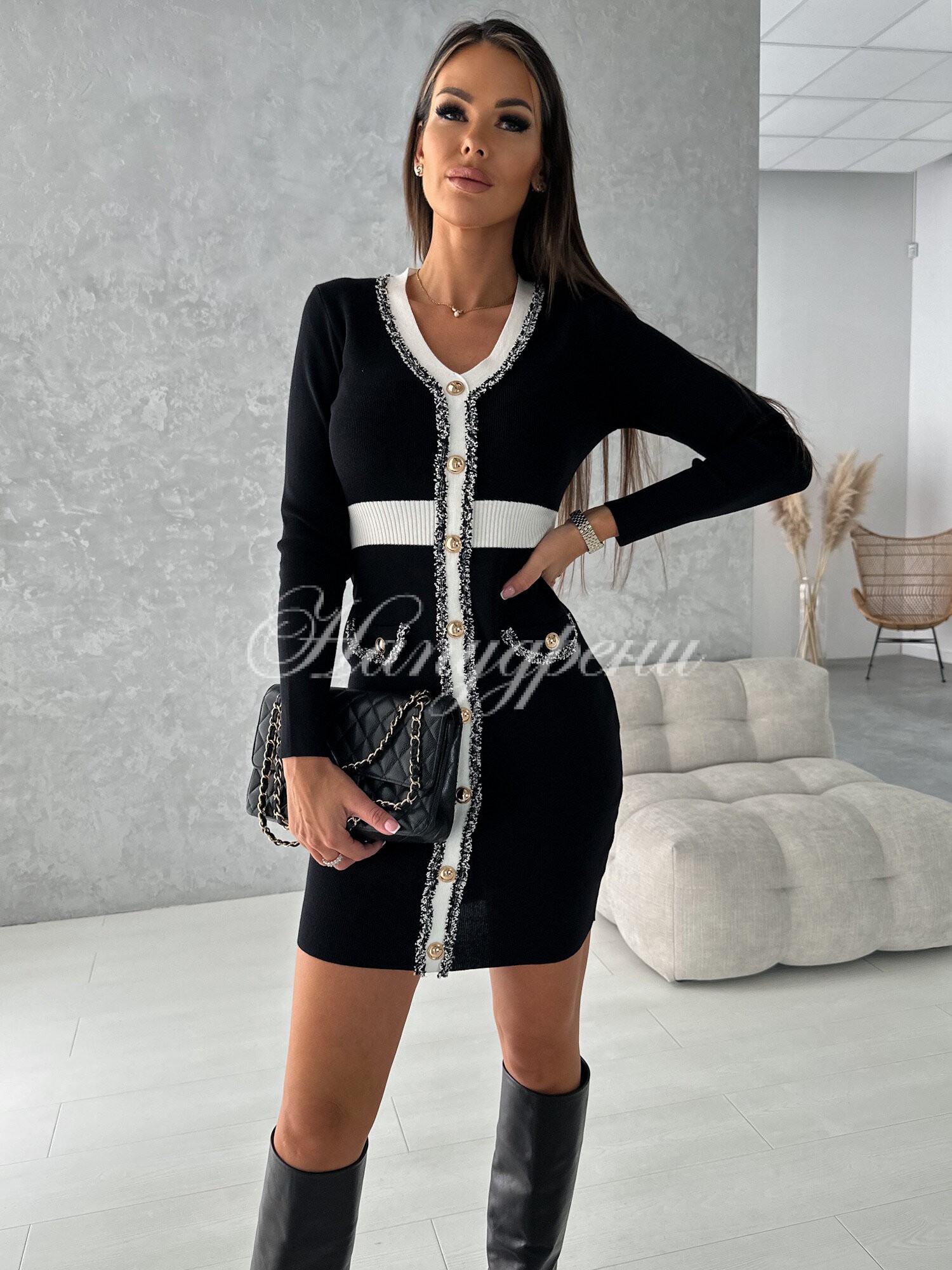 Черна рокля с бели кантове и ефектни детайли по тях – код 6085