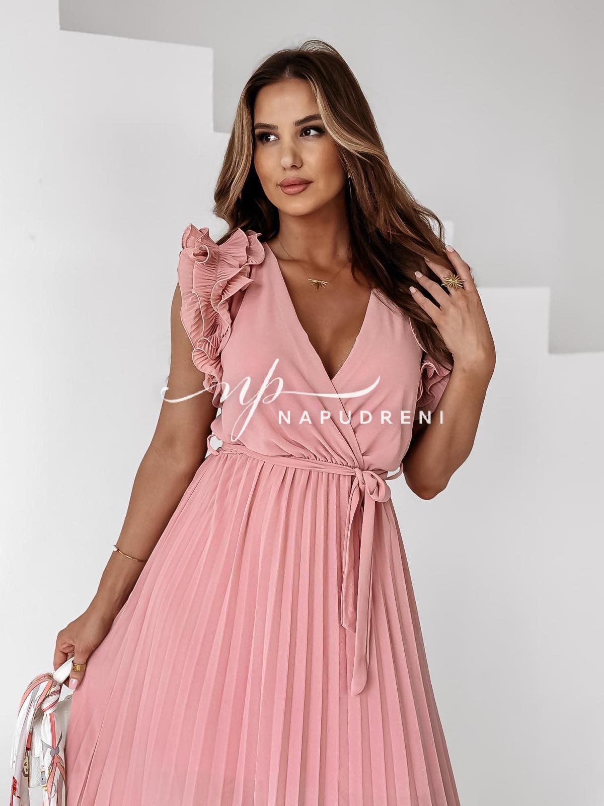 Дамска плисирана дълга рокля в цвят пудра – код 7293