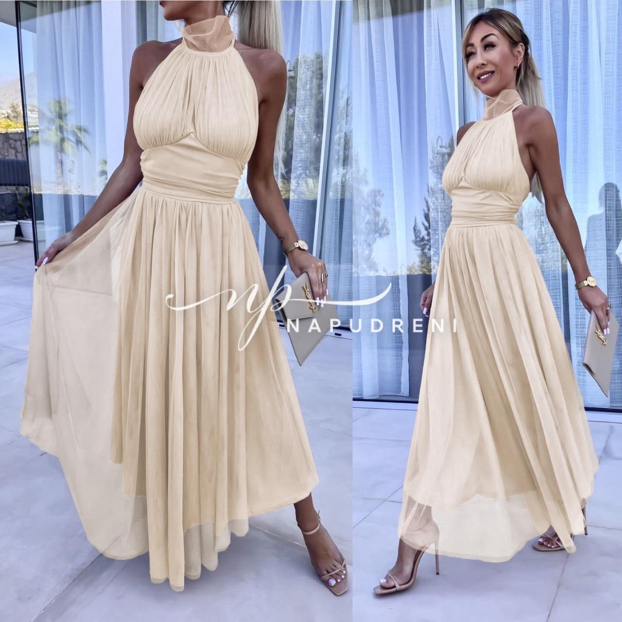 Дамска рокля с тюл и ефектна кройка в бежов цвят – код 6913