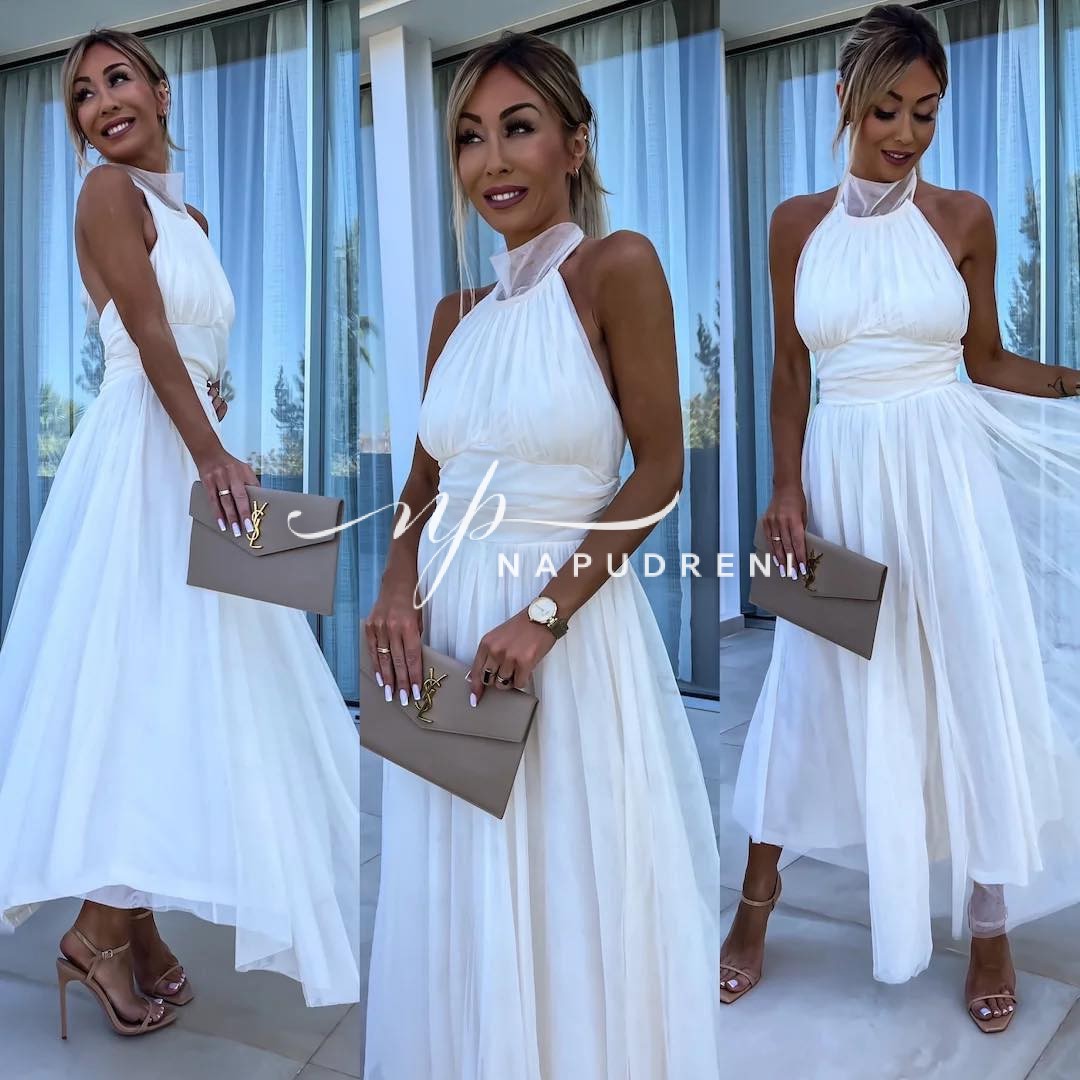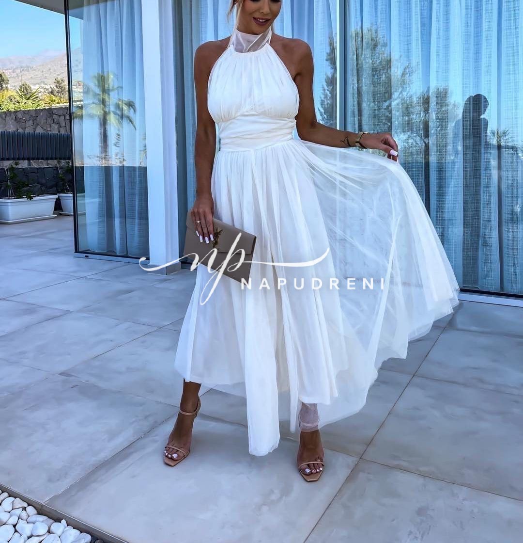 Дамска рокля с тюл и ефектна кройка в бял цвят – код 6910