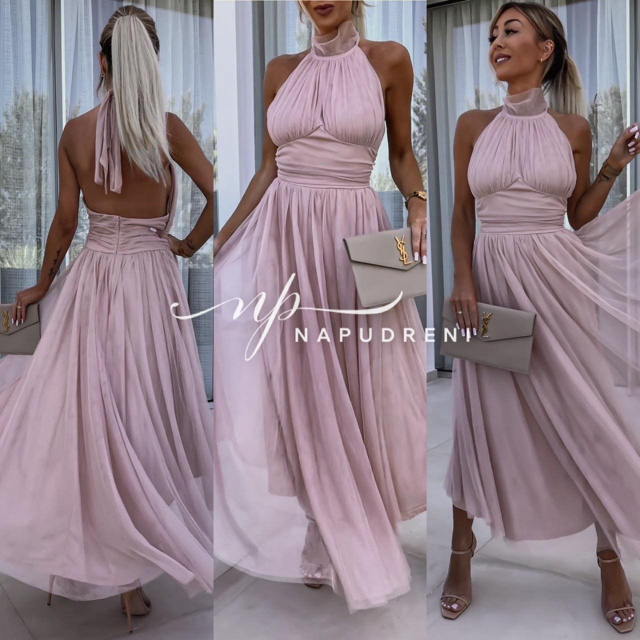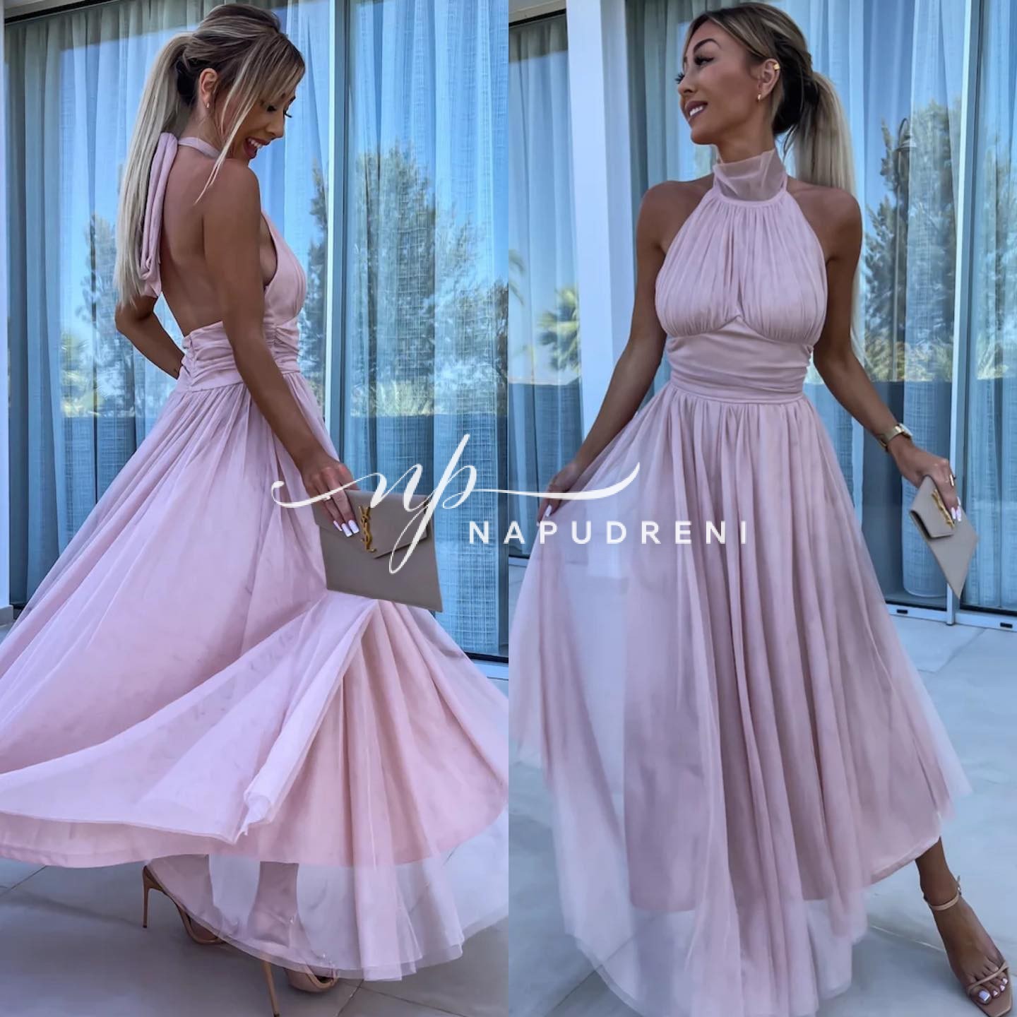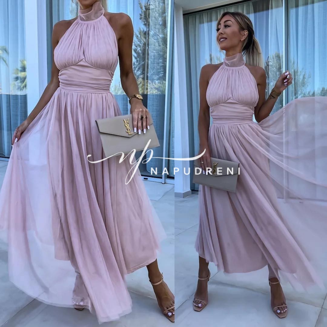 Дамска рокля с тюл и ефектна кройка в розов цвят – код 6911