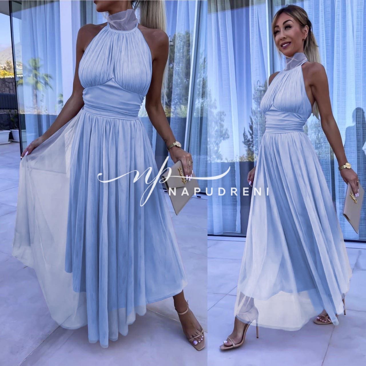 Дамска рокля с тюл и ефектна кройка в син цвят – код 6908