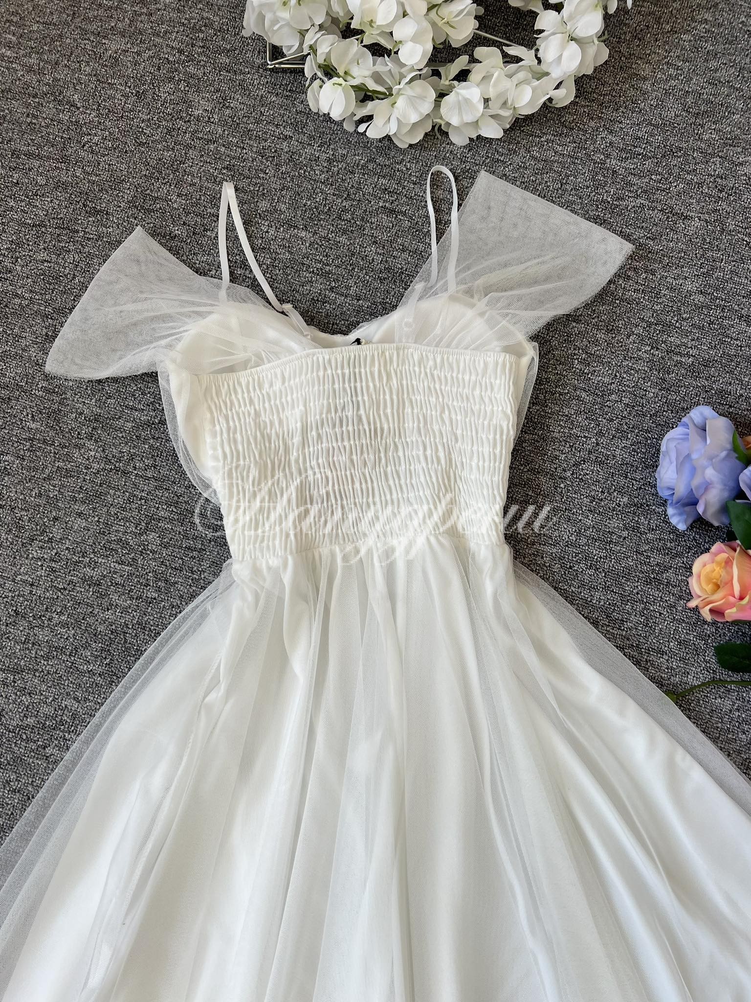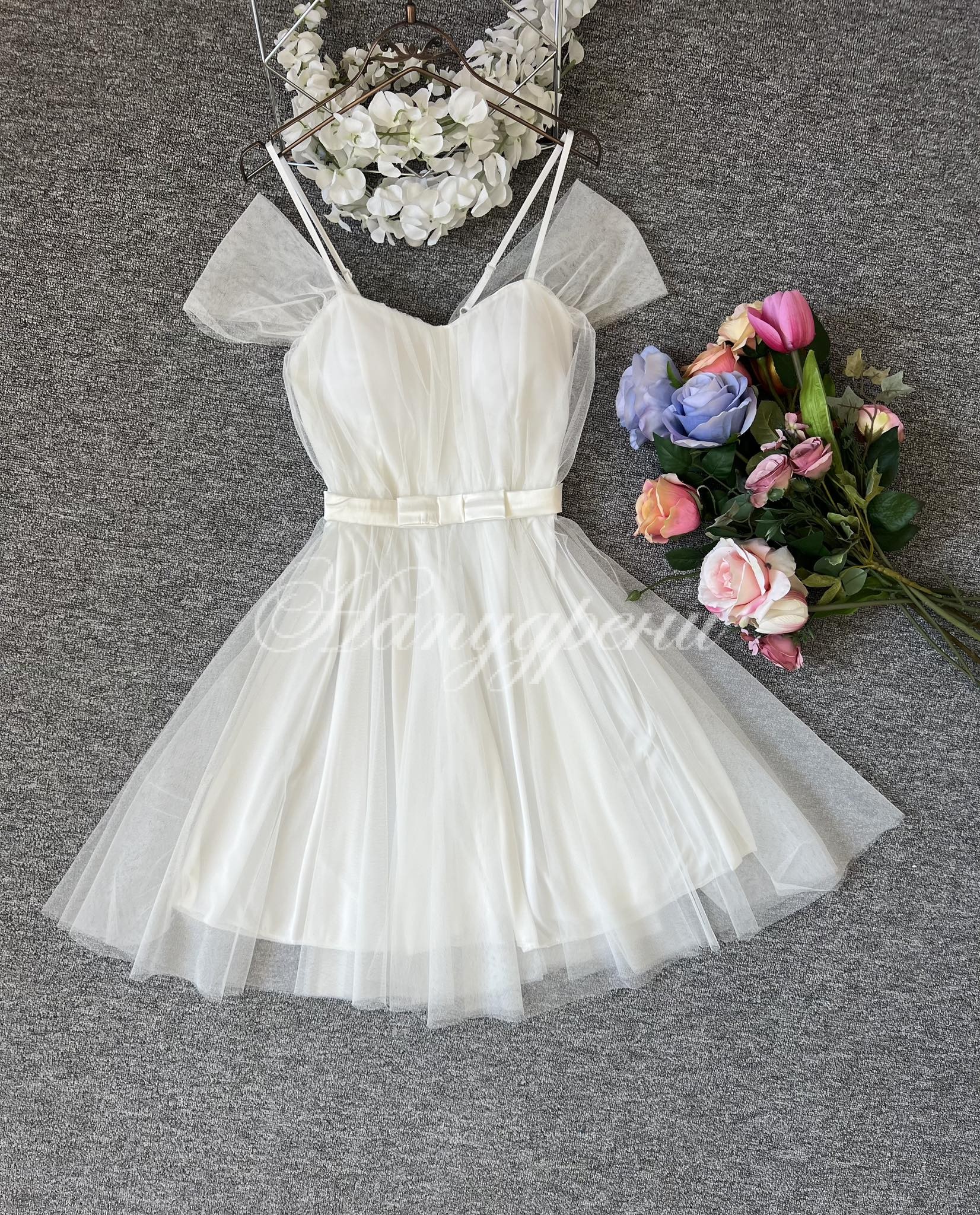 Елегантна тюлена рокля с нежна панделка в областта на талията.