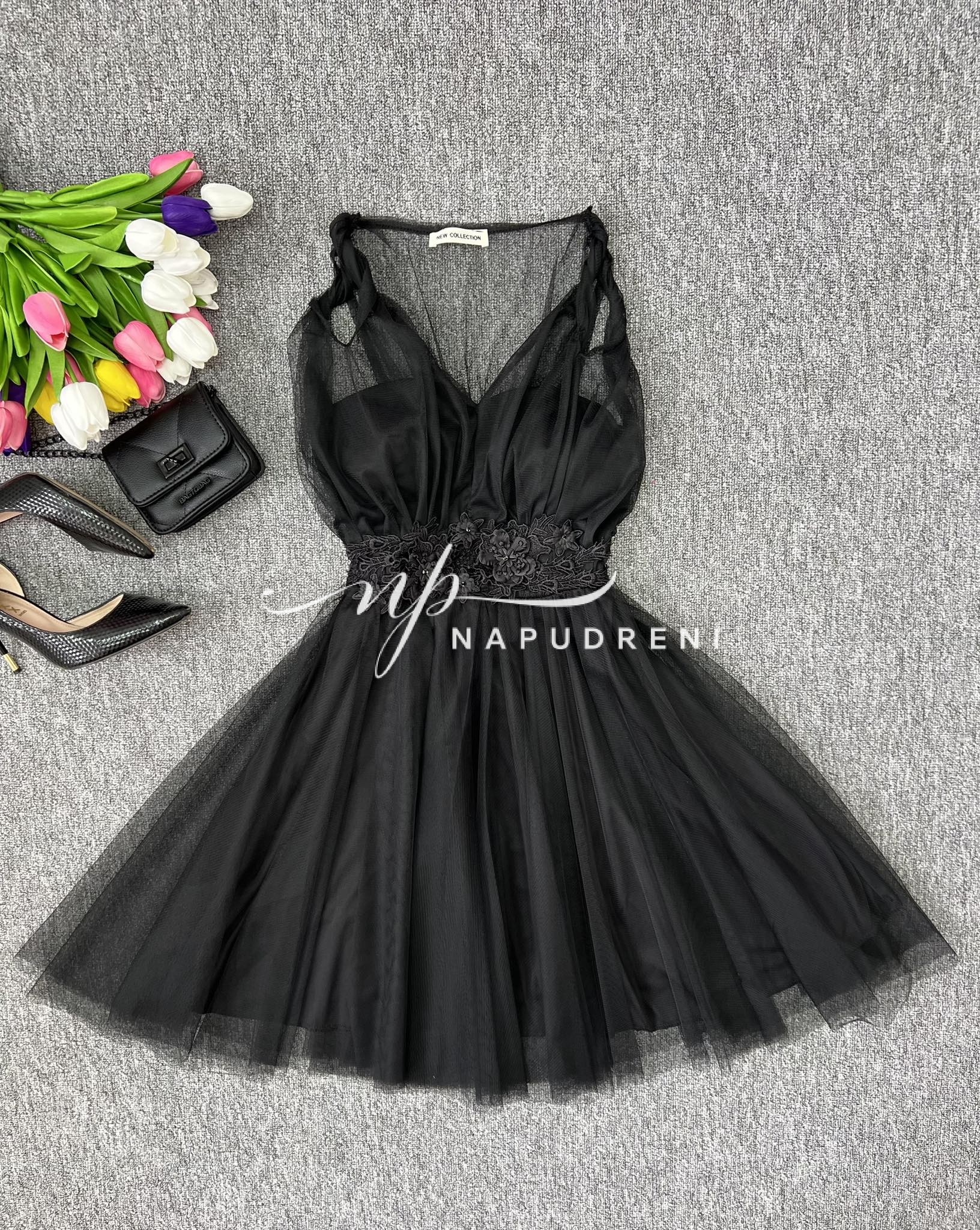 Дамска рокля с тюл и дантела в черен цвят – код 7031