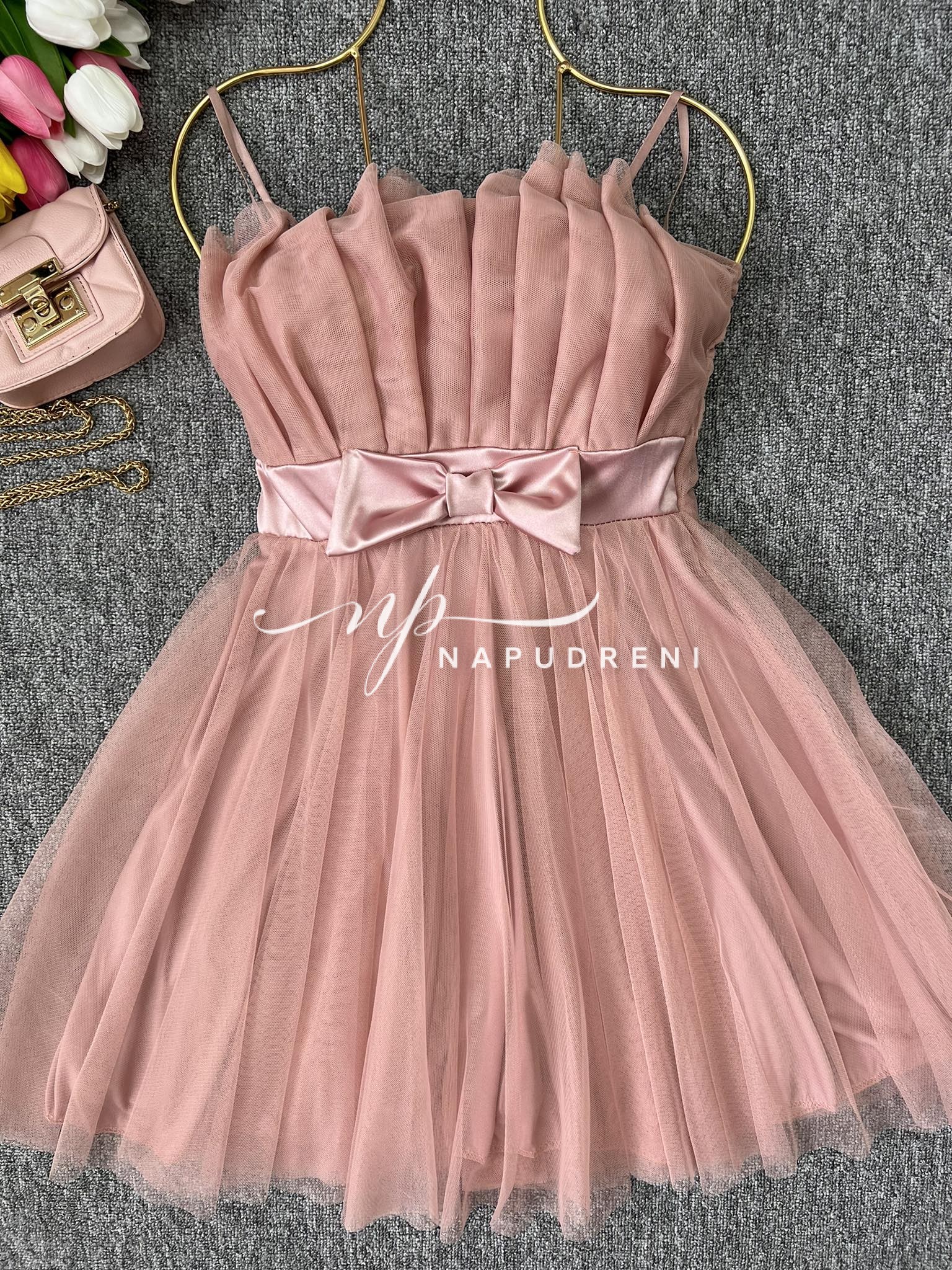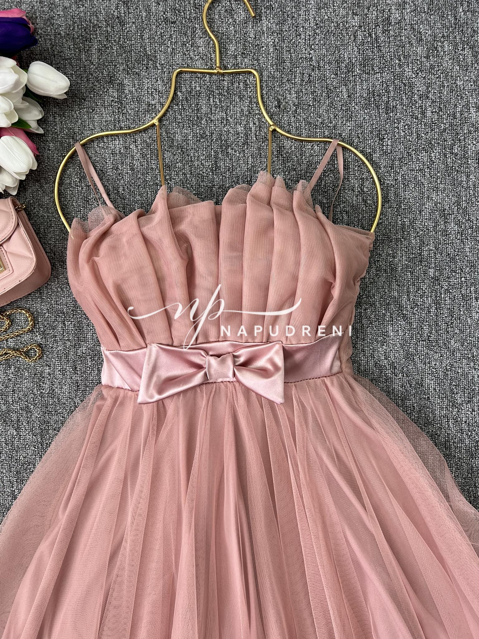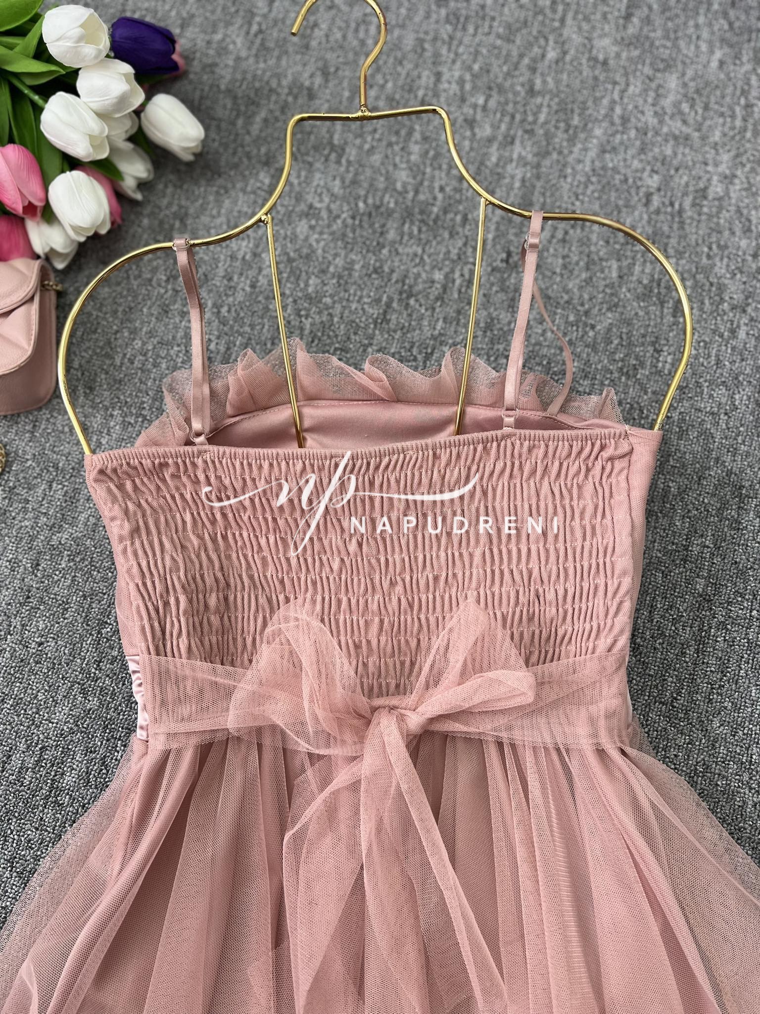 Кокетна дамска рокля с тюл в цвят пудра – код 7029
