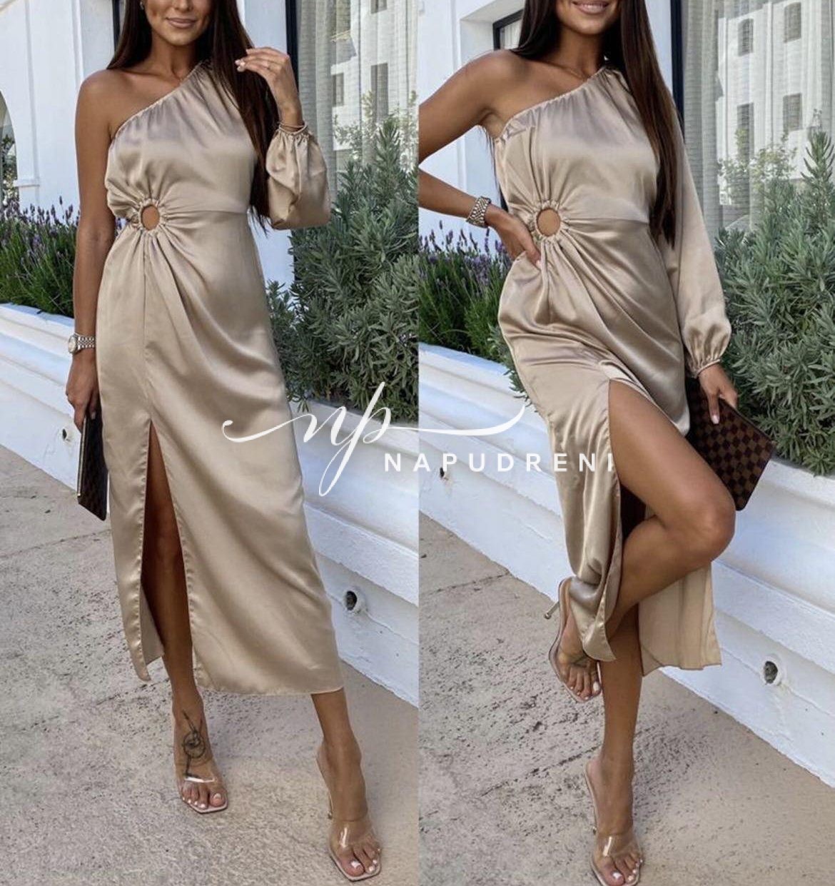 Сатенена рокля с ефектна кройка в бежов цвят – код 7304
